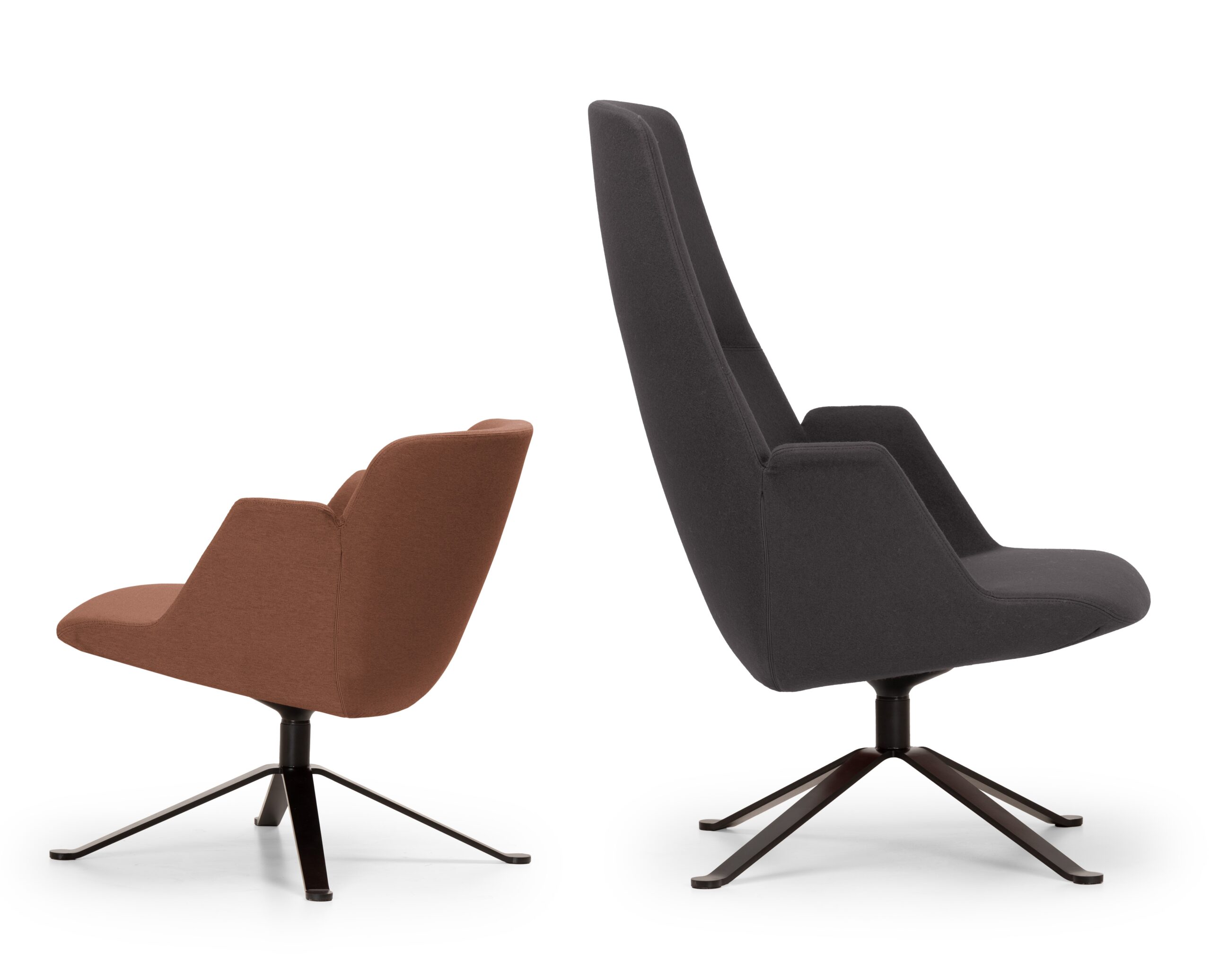 The new polyurethane shell is available in chair and armchair version with double backrest height. The design is characterized by the pronounced lines of the compact armrest and the stitching that shapes the backrest in a vertical direction. It is available with a solid wood 4 legs base or with a 4-spoke steel swivel base.